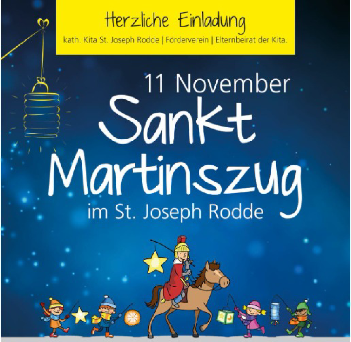 Um 17 Uhr beginnt das Martinsspiel auf dem Schulhof der Grundschule Rodde. Im Anschluss sind alle Teilnehmenden zu einem gemütlichen Umtrunk im Gemeinderaum der Kirche St. Josef herzlich eingeladen. Angeboten werden Glühwein, Kinderpunsch und Würstchen im Brötchen. (Gegen eine Spende an den Förderverein der Kita St. Joseph Rodde)