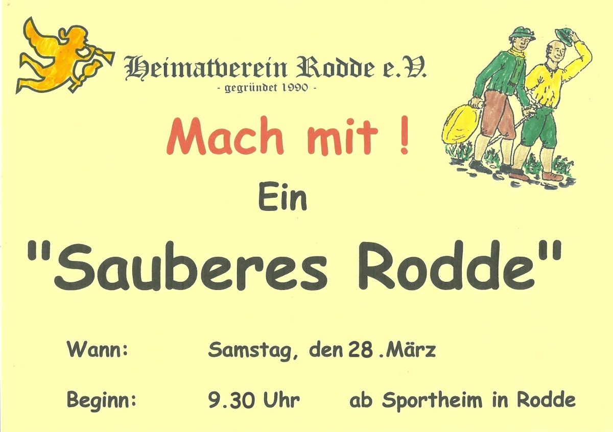 Dieses Jahr findet die Aktion "Sauberes Rodde" Ende März am 28.3. statt und wird etwas nach kalendarischem Frühjahrsbeginn wieder für eine saubere Umwelt sorgen. Es haben sich wieder sehr viele Vereine und die Jägerschaft bereit erklärt, in und um Rodde und Kanalhafen systematisch beim Frühjahrsputz aktiv zu sein. Natürlich sind auch alle interessierten Bürgerinnen und Bürger eingeladen mitzuhelfen. Organisiert wird die Aktion wieder vom Heimatverein Rodde.